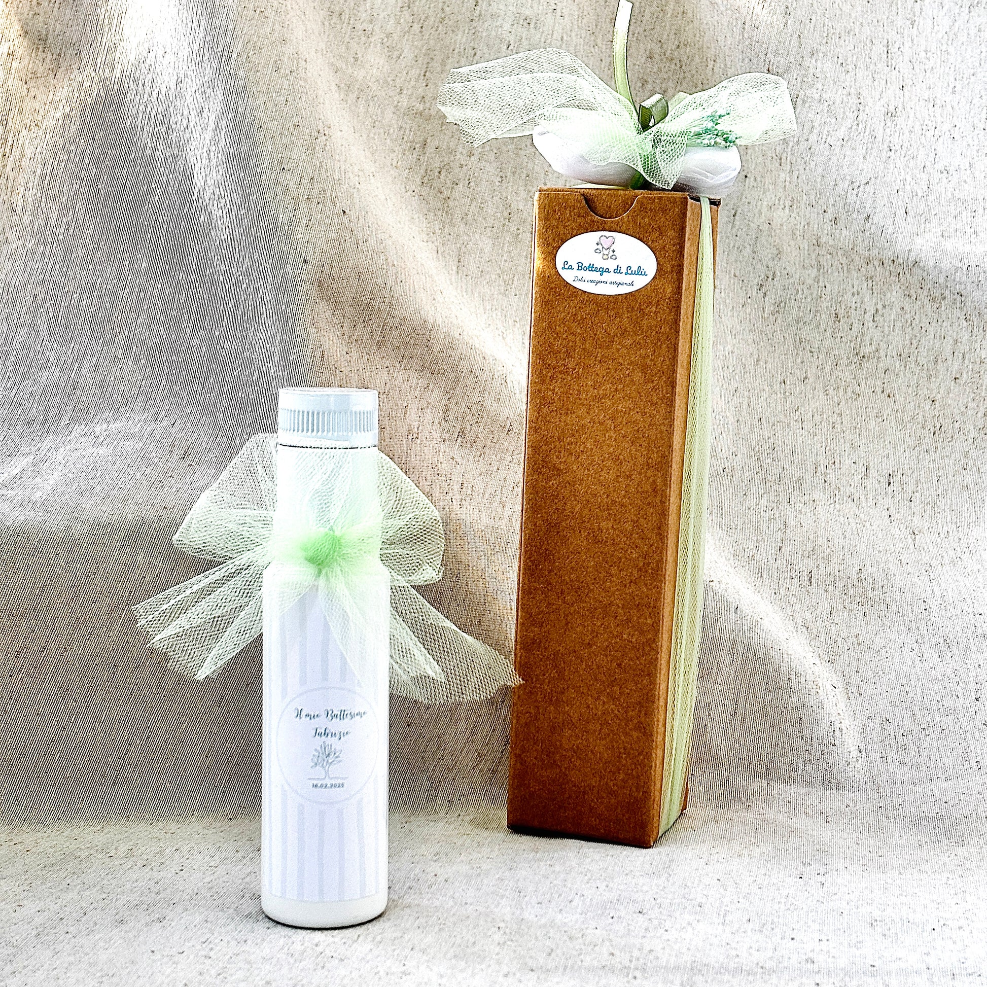 When purchasing, indicate precisely what you want to write on the label to be applied to the jar and what you want to engrave on the external box, the color of the chosen fabric, the color of the ribbon and confetti.