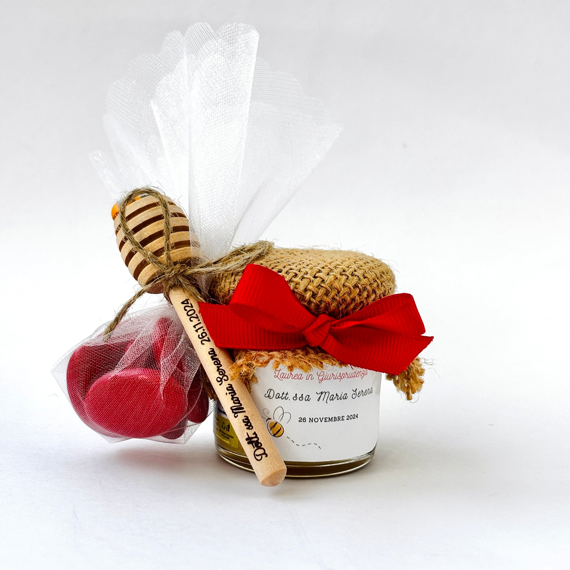 Graduation Favor Jar of artisanal wildflower honey 50 gr-140gr, red color, customizable label