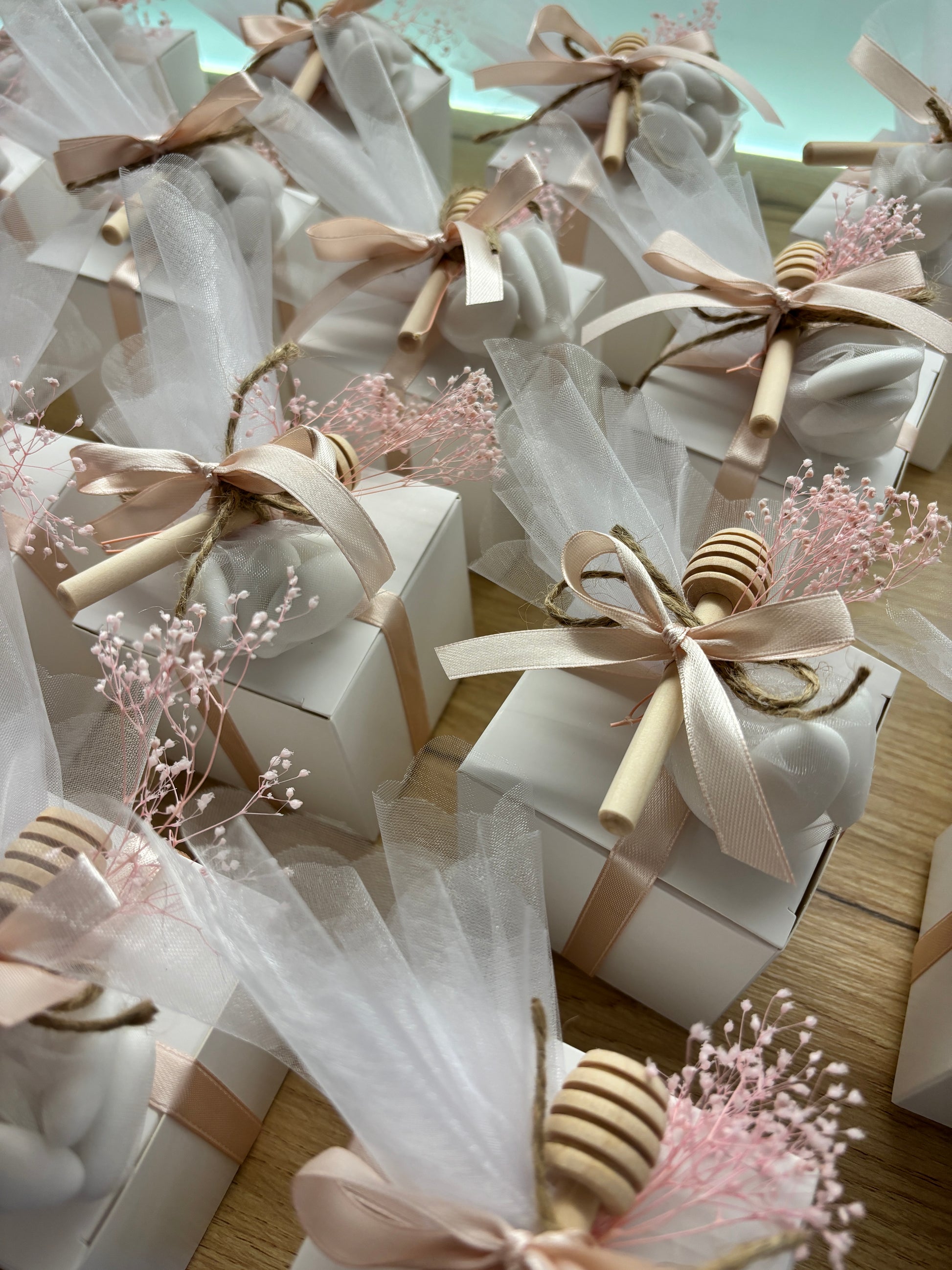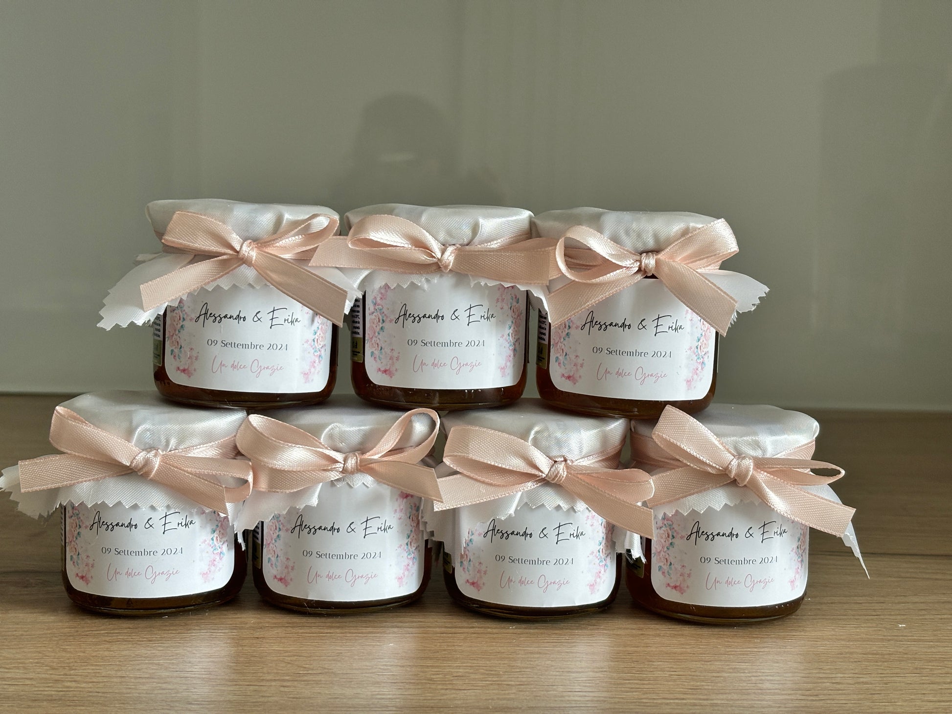 Wedding Favor Jar of artisanal wildflower honey 50 gr-140gr-250 gr, white and antique pink color, customizable label