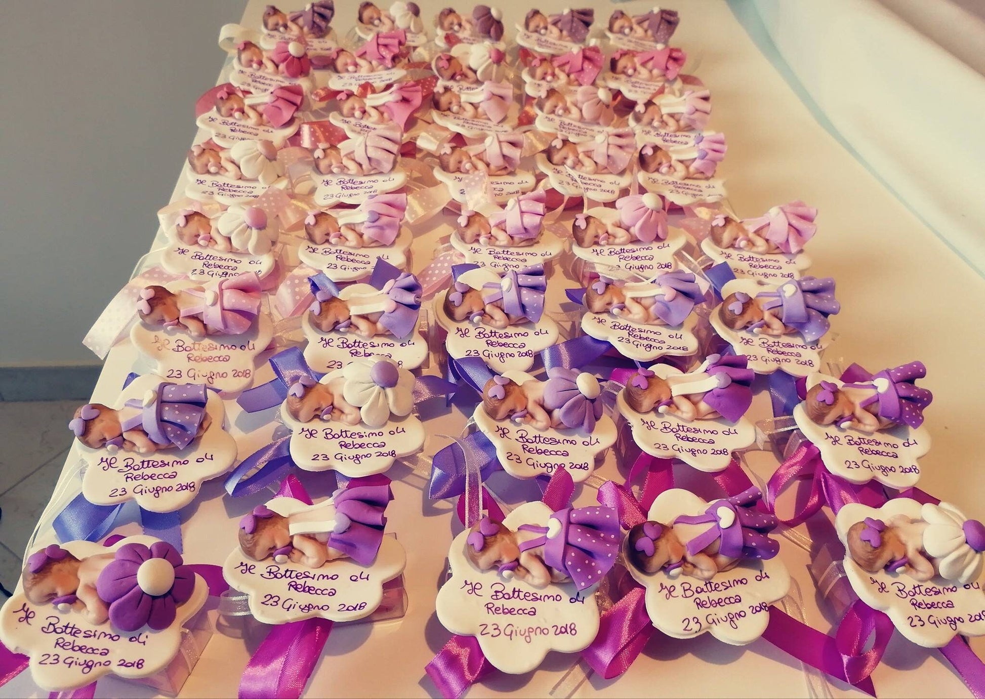 Birth/baptism favor for girls in Lilac Fuchsia Purple fimo with personalized white flower base
