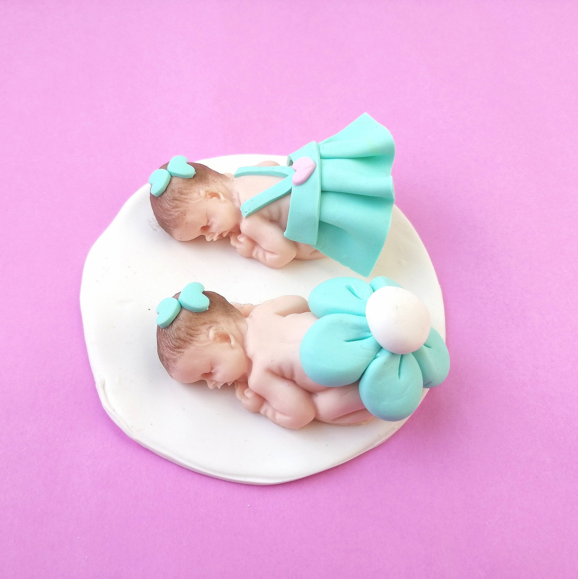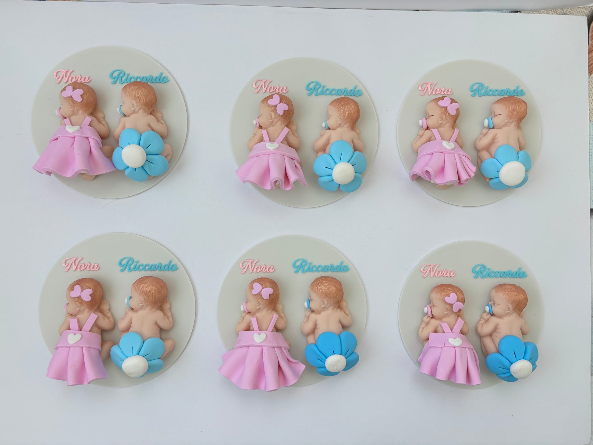 Birth and Baptism favor for colored twin girls in fimo with white base 10cm x 10cm with handmade personalized name
