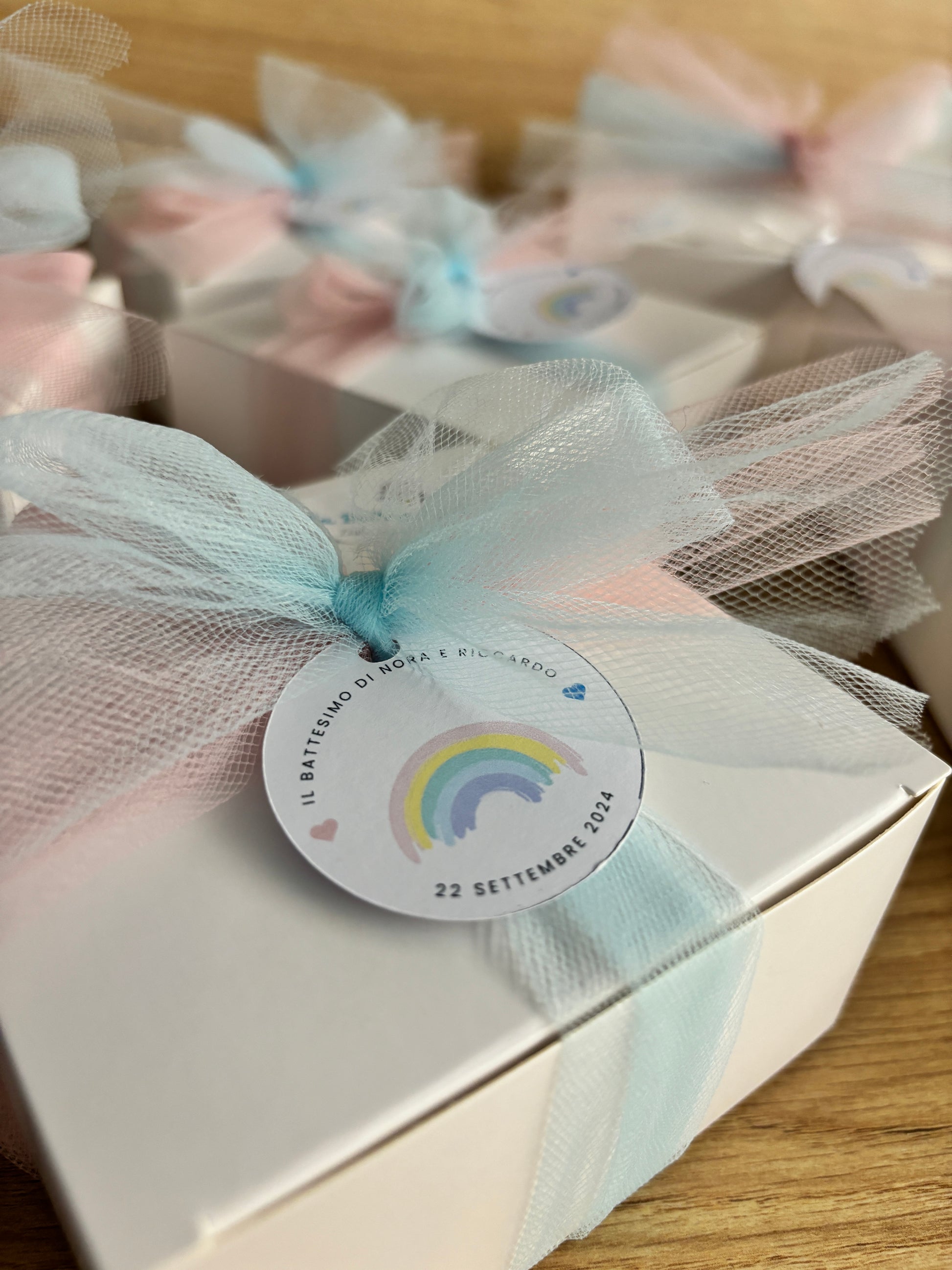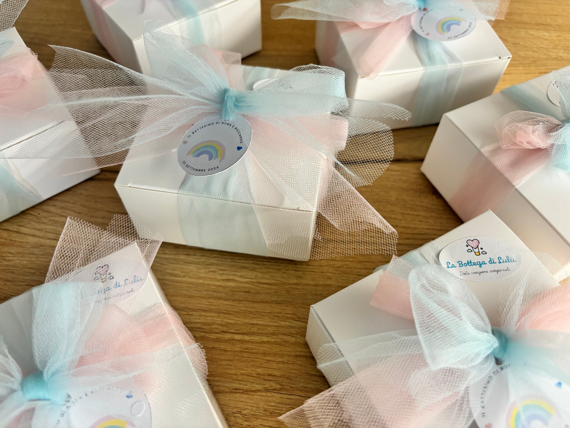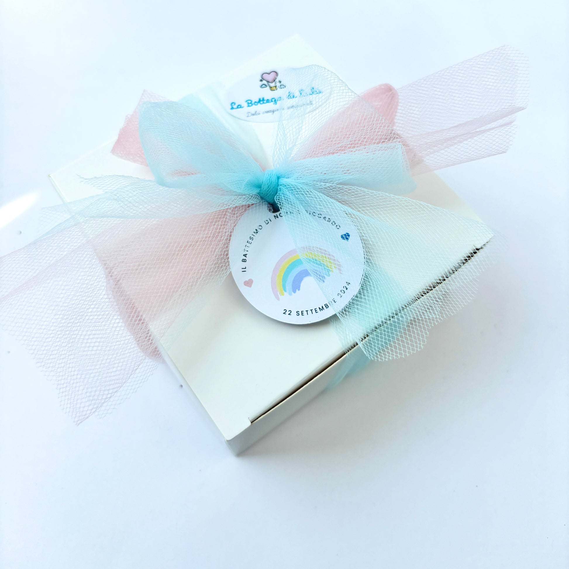Depending on your choice, you can choose to have the girls without a box, or complete with a box with ribbon and pink confetti.