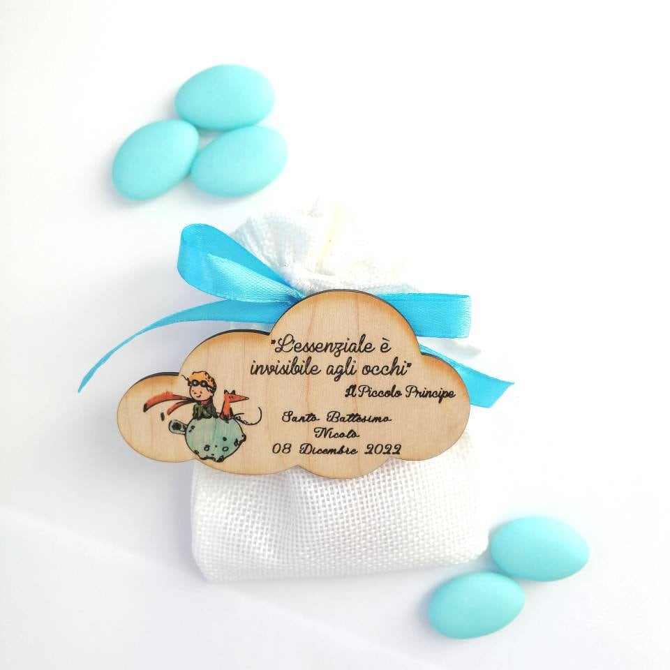 Personalized Little Prince wooden magnet for First Communion, Birth, Baptism + light blue confetti bag