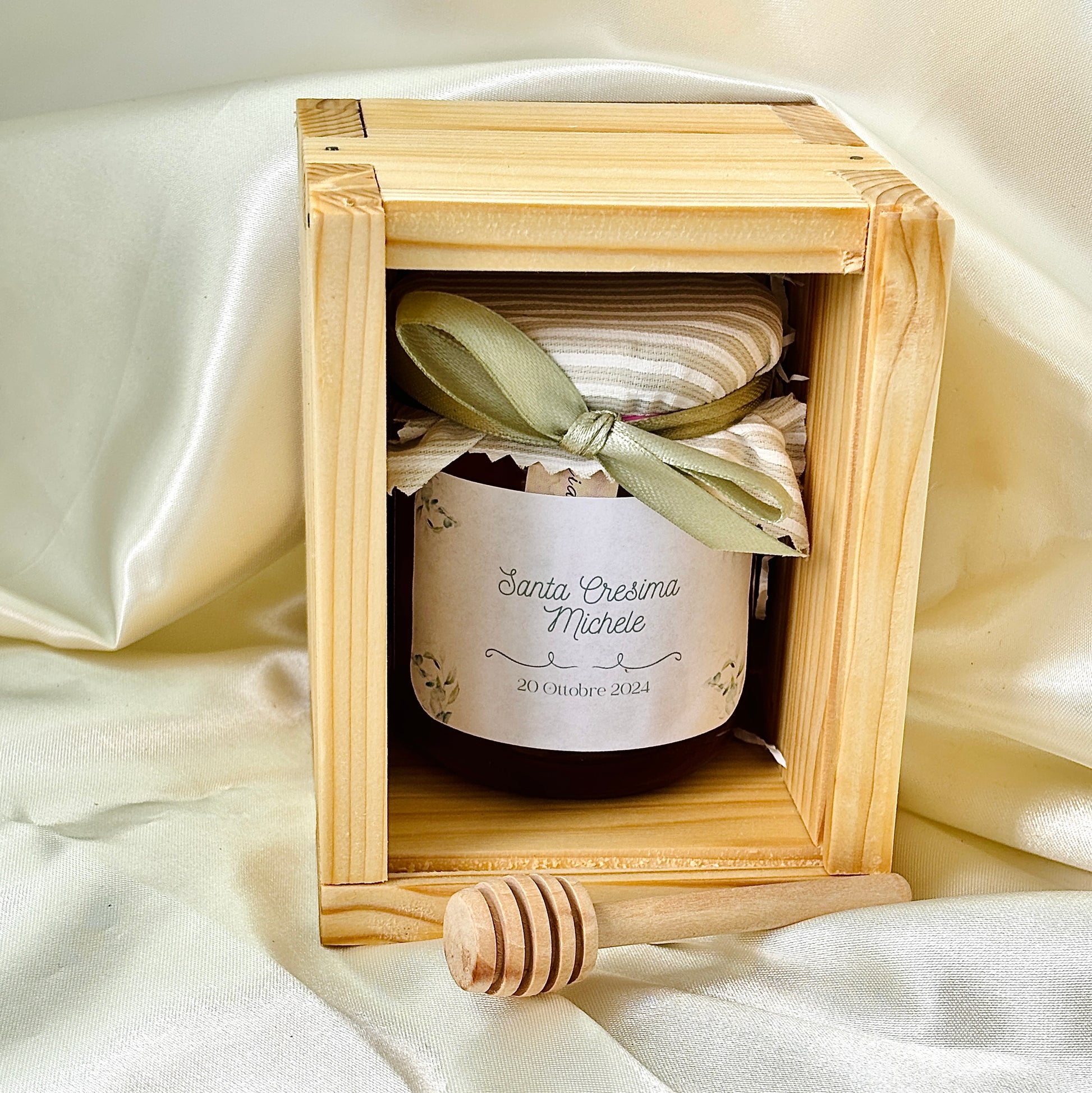 Wooden Box for Baptism Jar of Millefiori Honey - Acacia - Chestnut handcrafted 250gr