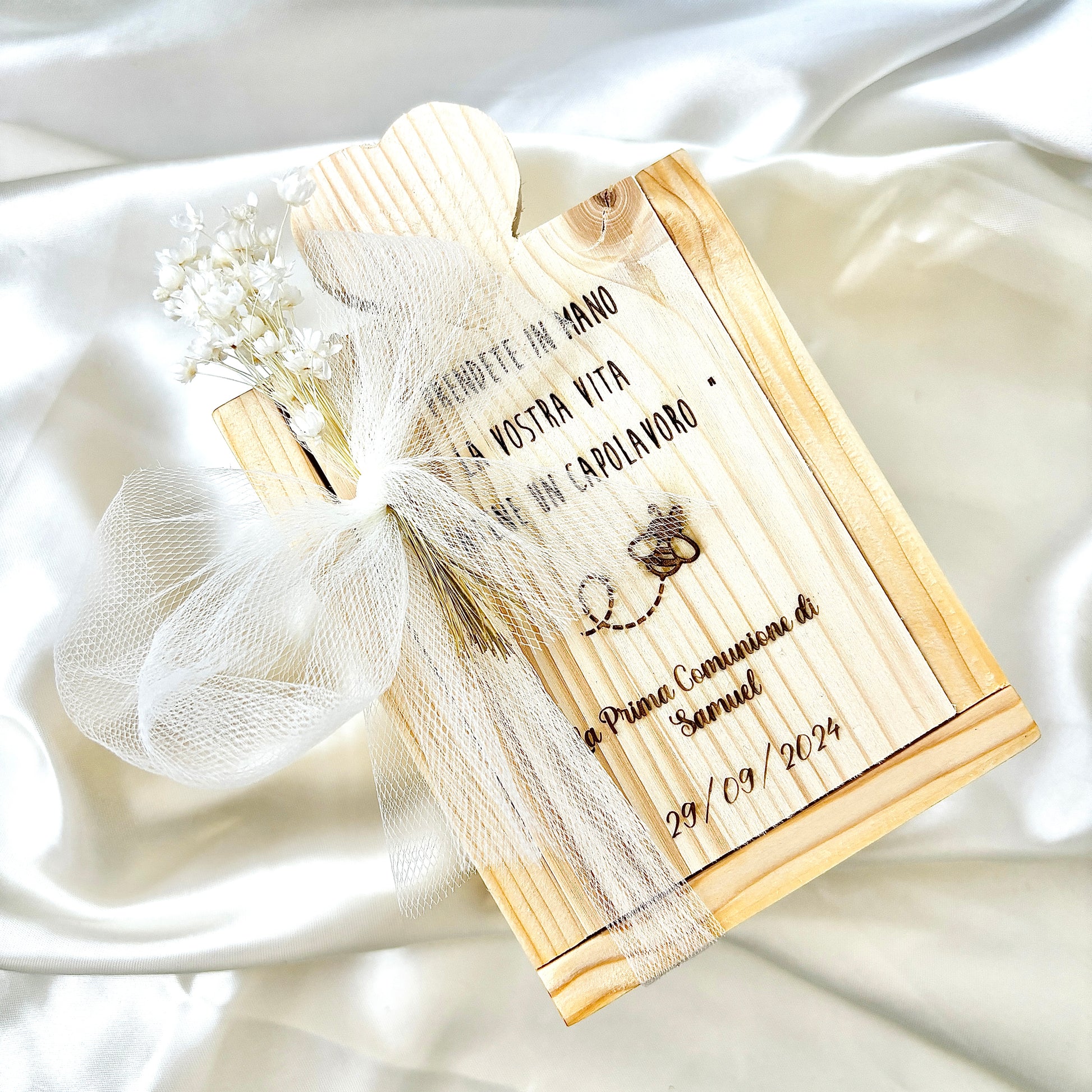 When purchasing, indicate precisely what you want to write on the label to be applied to the jar and what you want to engrave on the external box, the color of the chosen fabric, color of the ribbon and confetti.