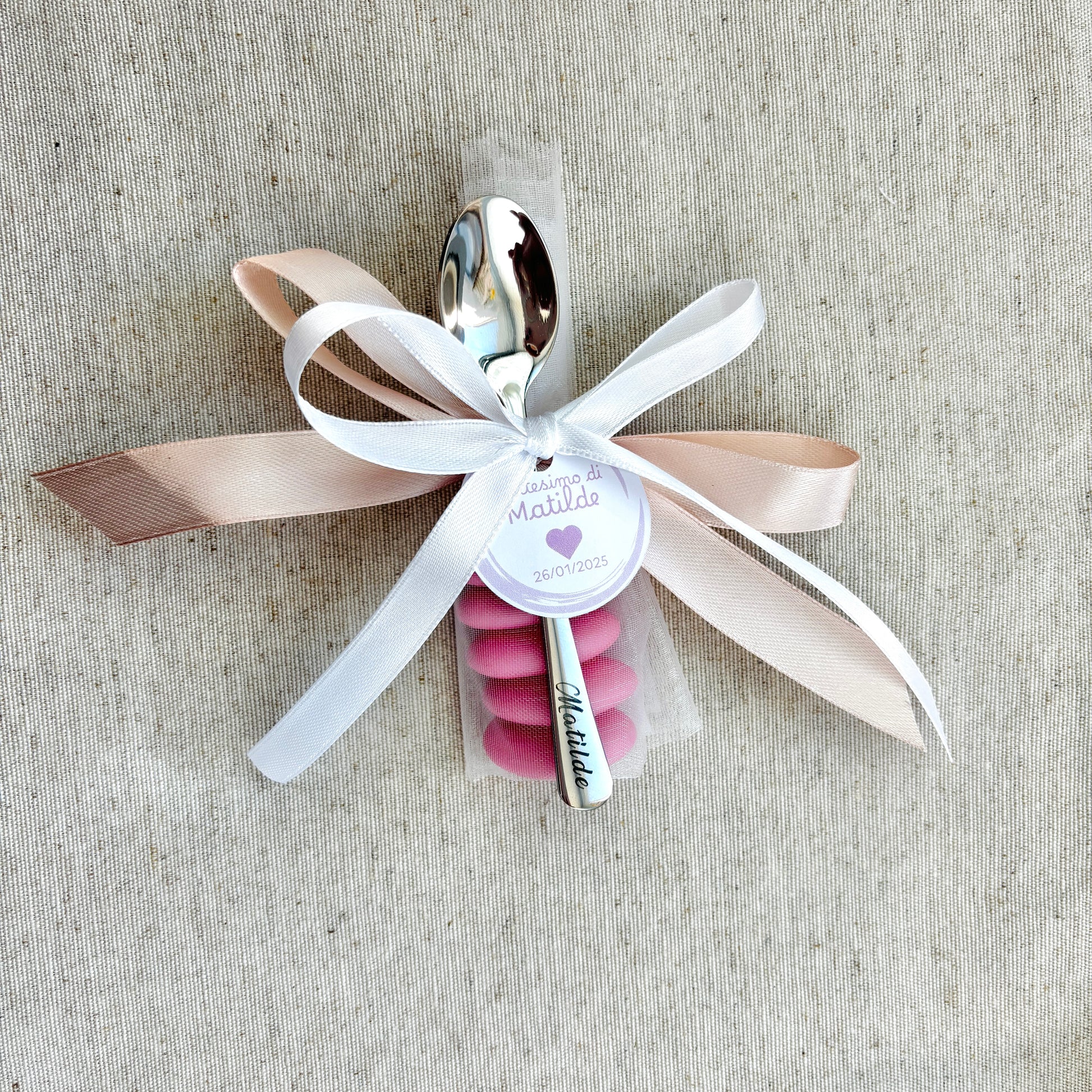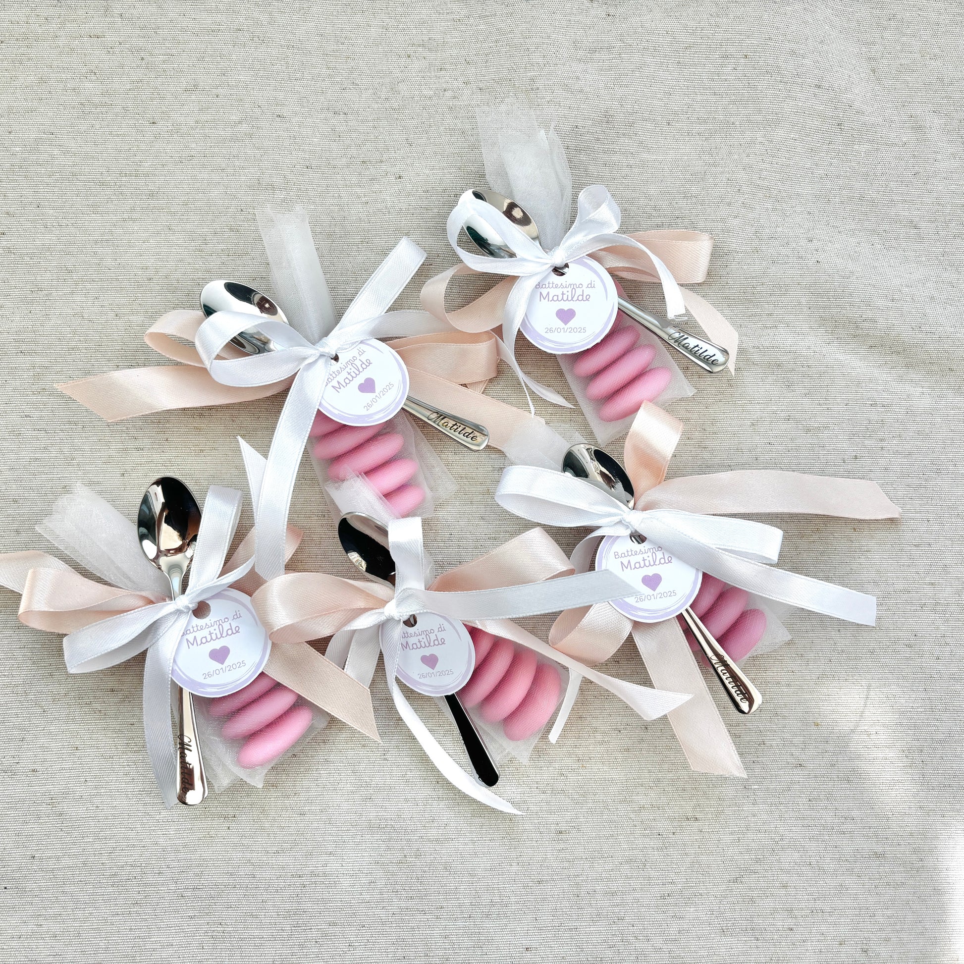 If you have chosen the "packaged" option, based on the name chosen for the engraving, the packaging will be made with pink or light blue ribbon and with the 5 corresponding sugared almonds.