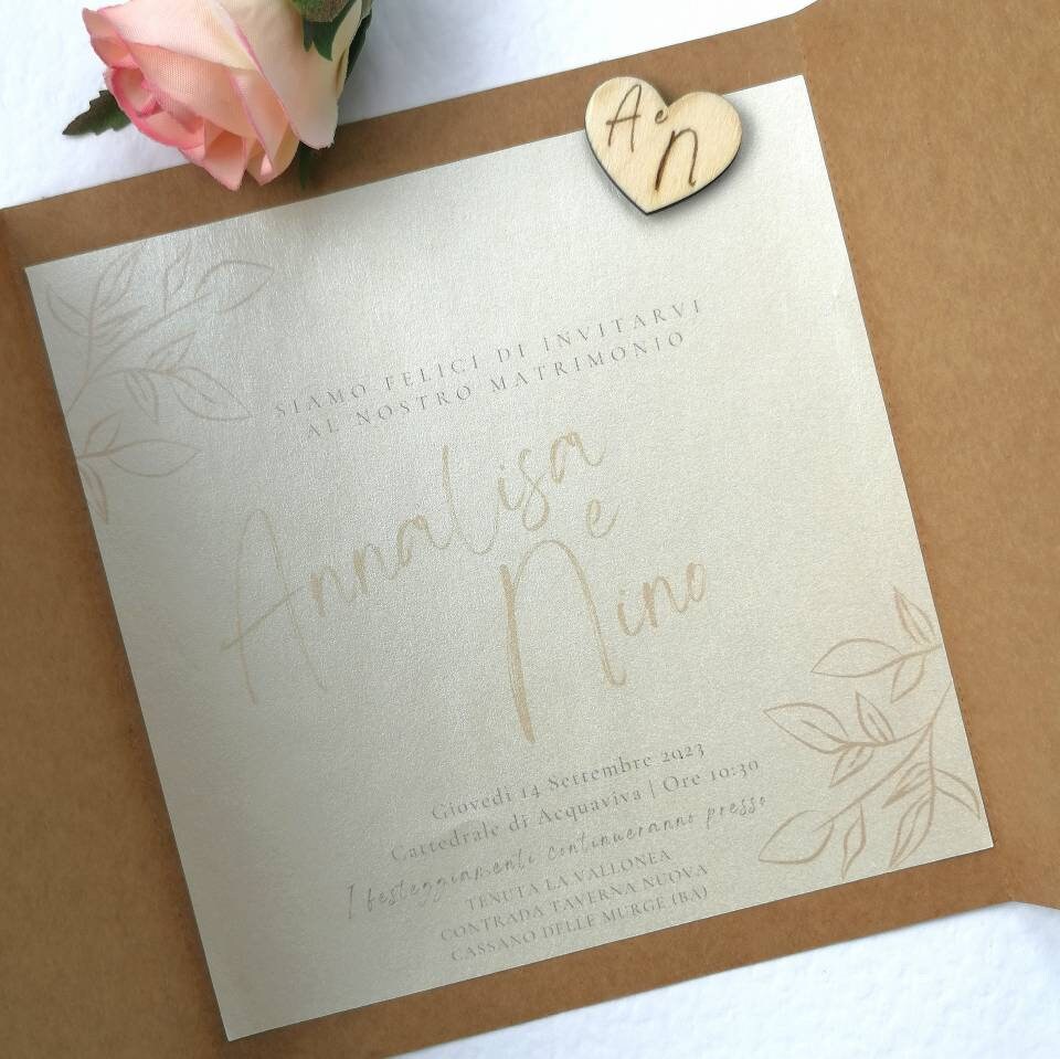two types of internal cardboard and external decorative finishes available: hammered ivory 200g or pearl ivory 160g, closure with ribbon or string, wooden heart with initials or golden sealing wax.