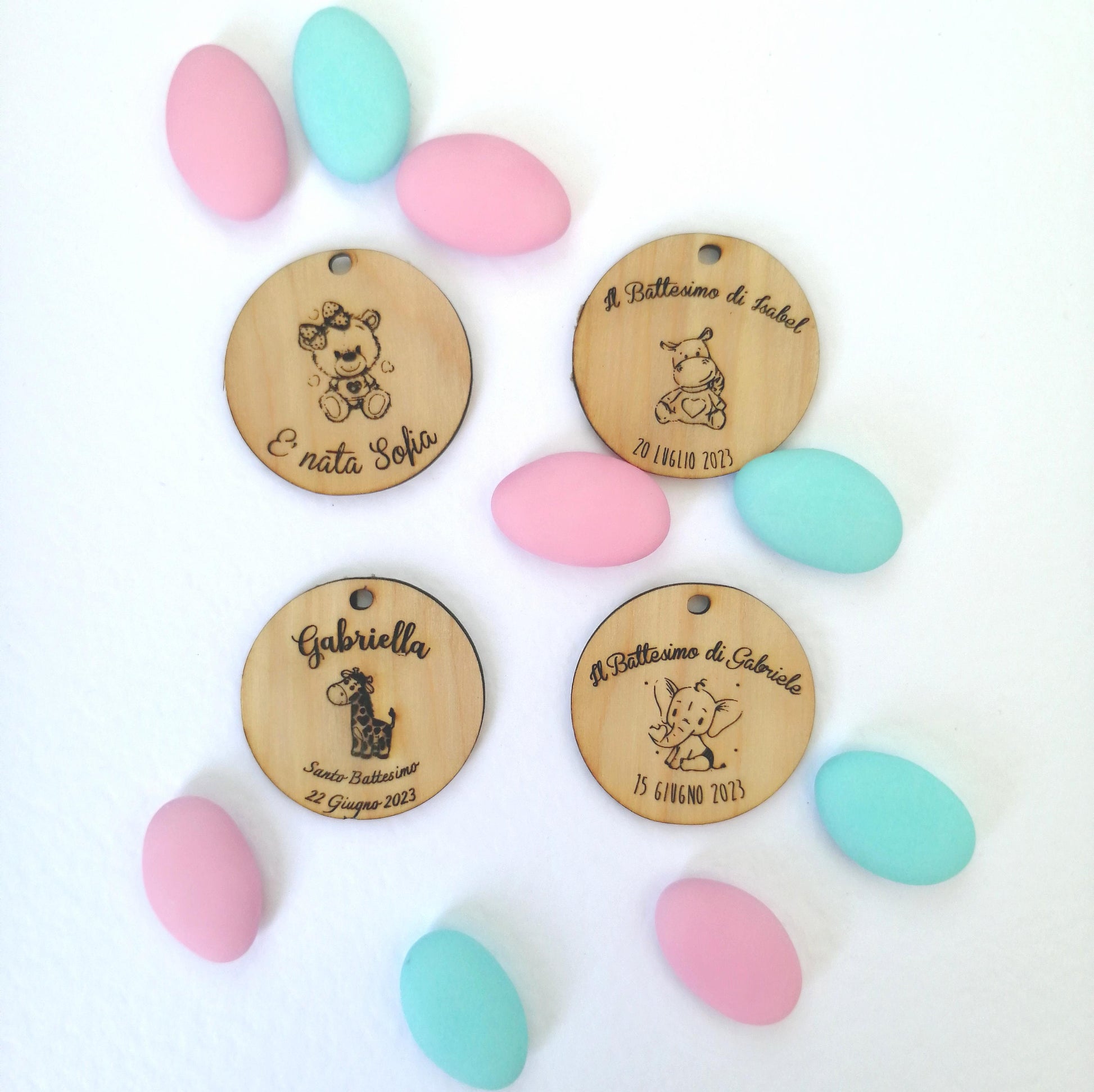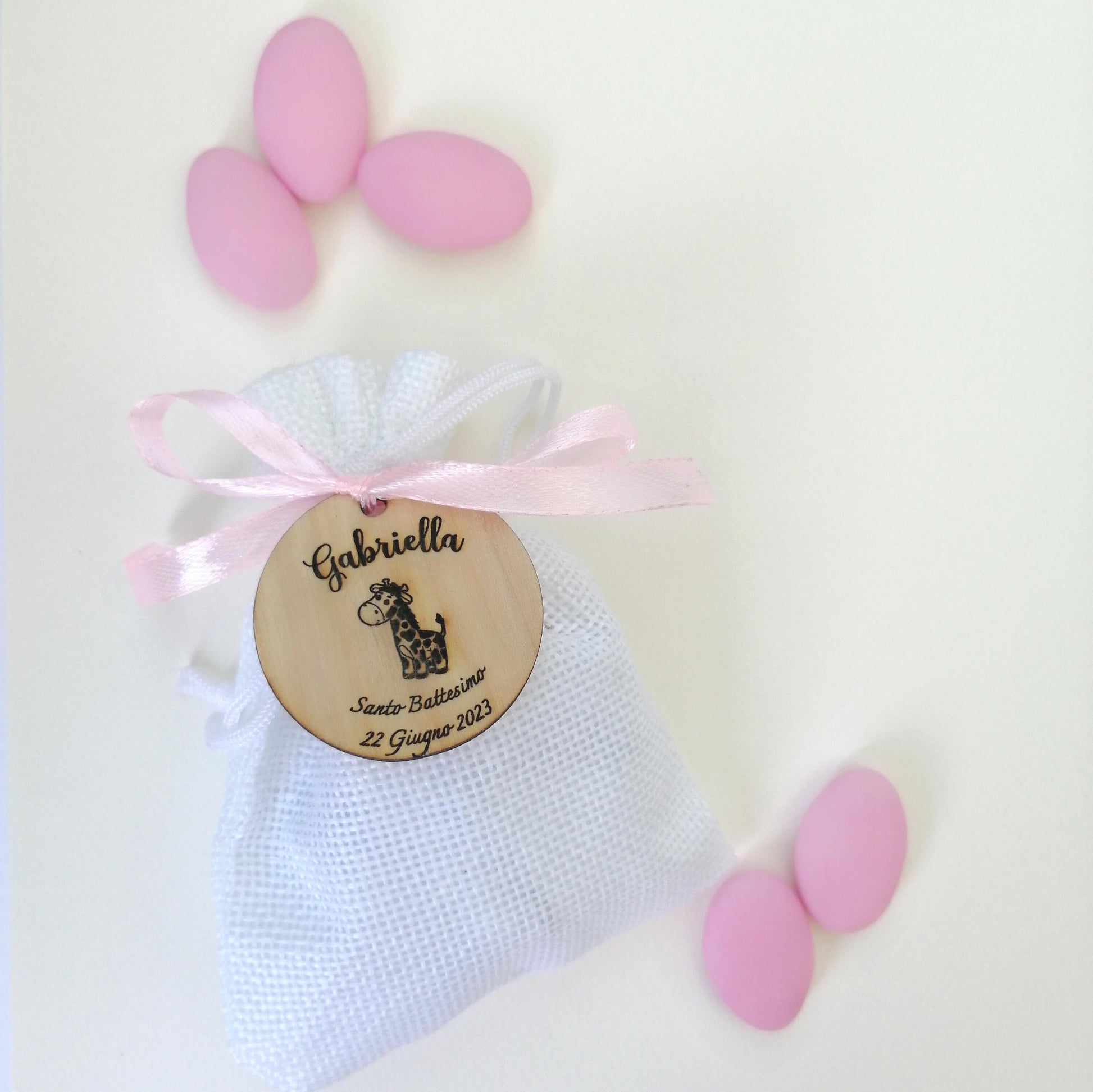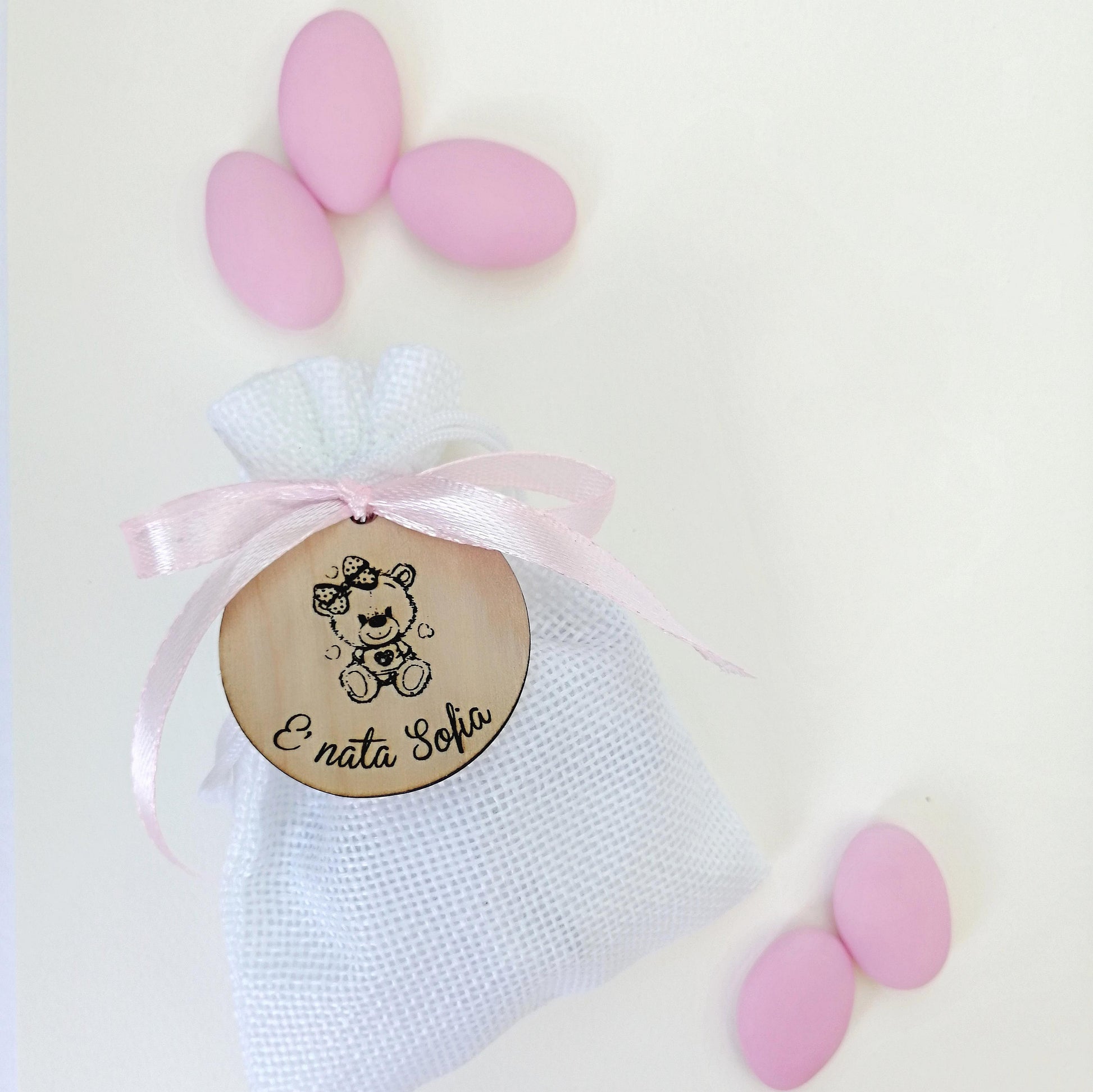 Confetti bag for Birth and Baptism with personalized wooden tag, handcrafted wedding favour