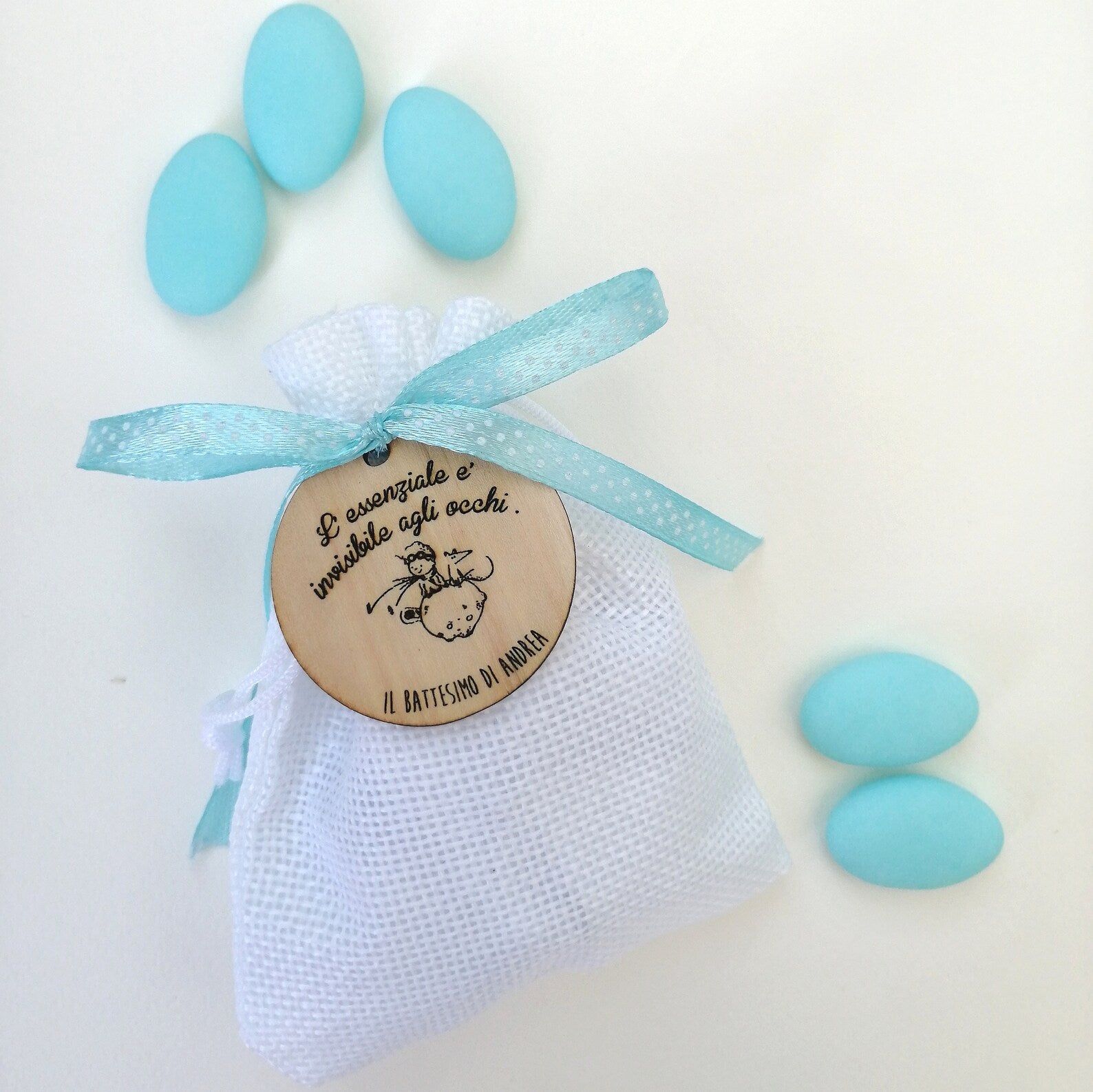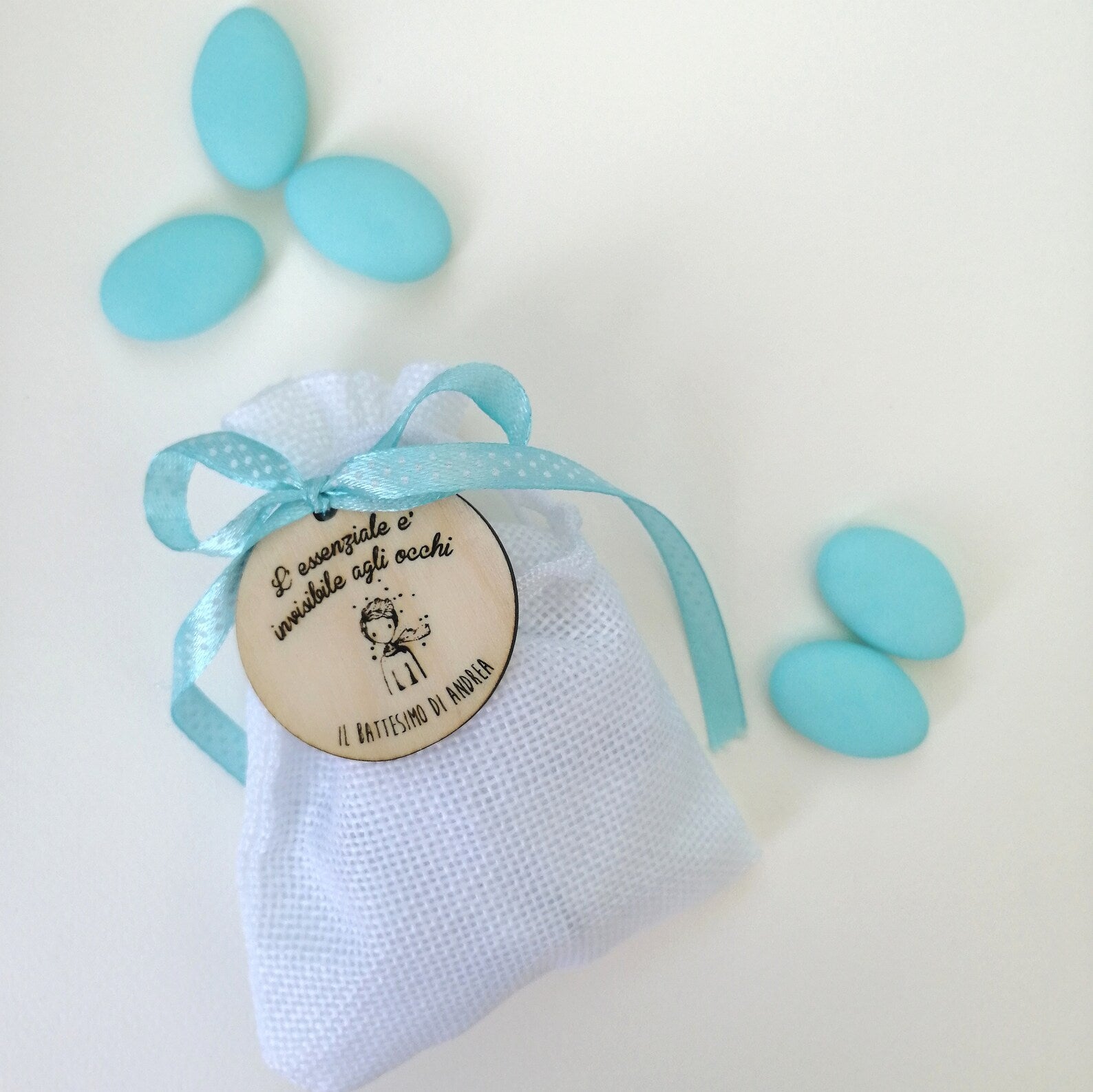 Confetti bag for Birth and Baptism with personalized wooden tag, handcrafted Little Prince favor