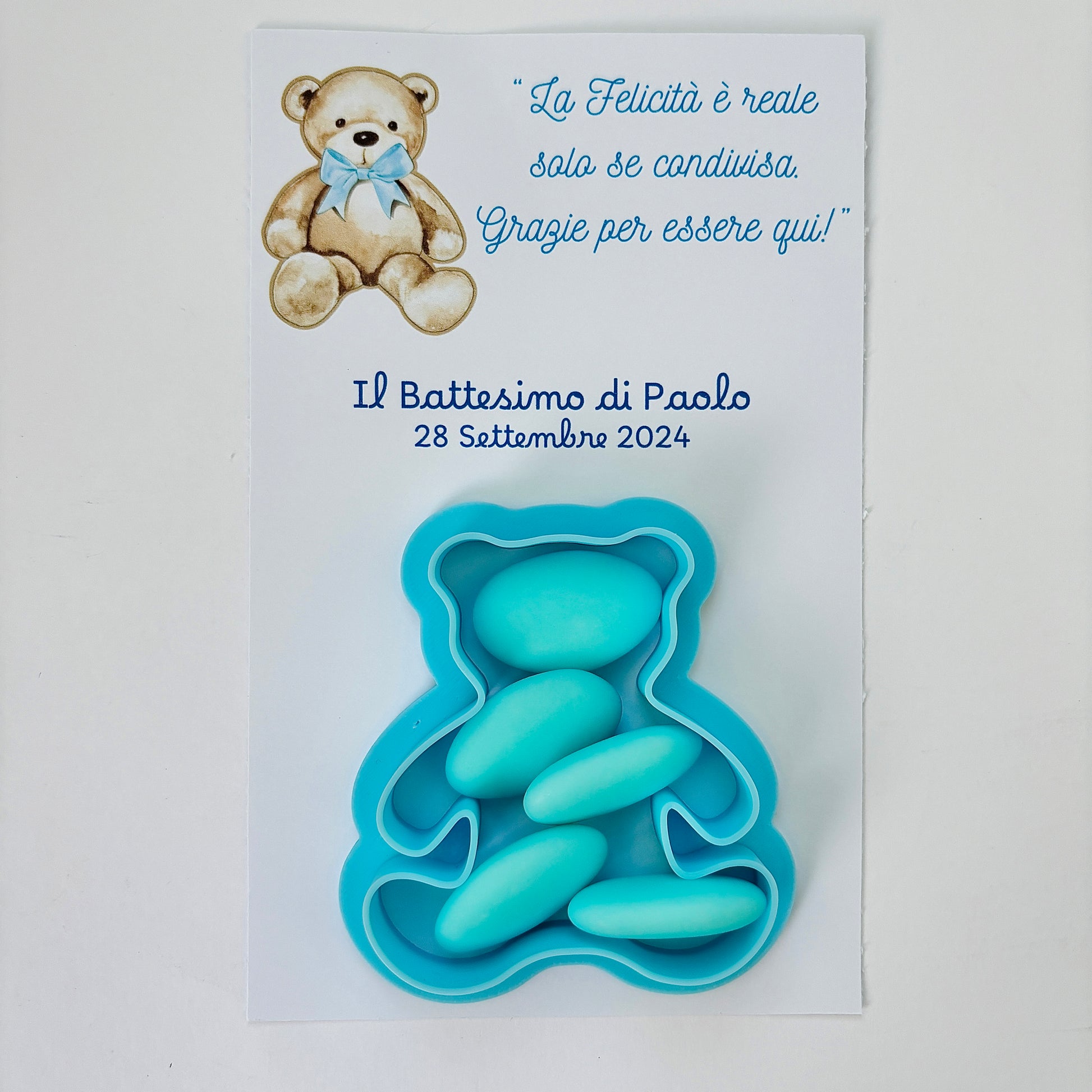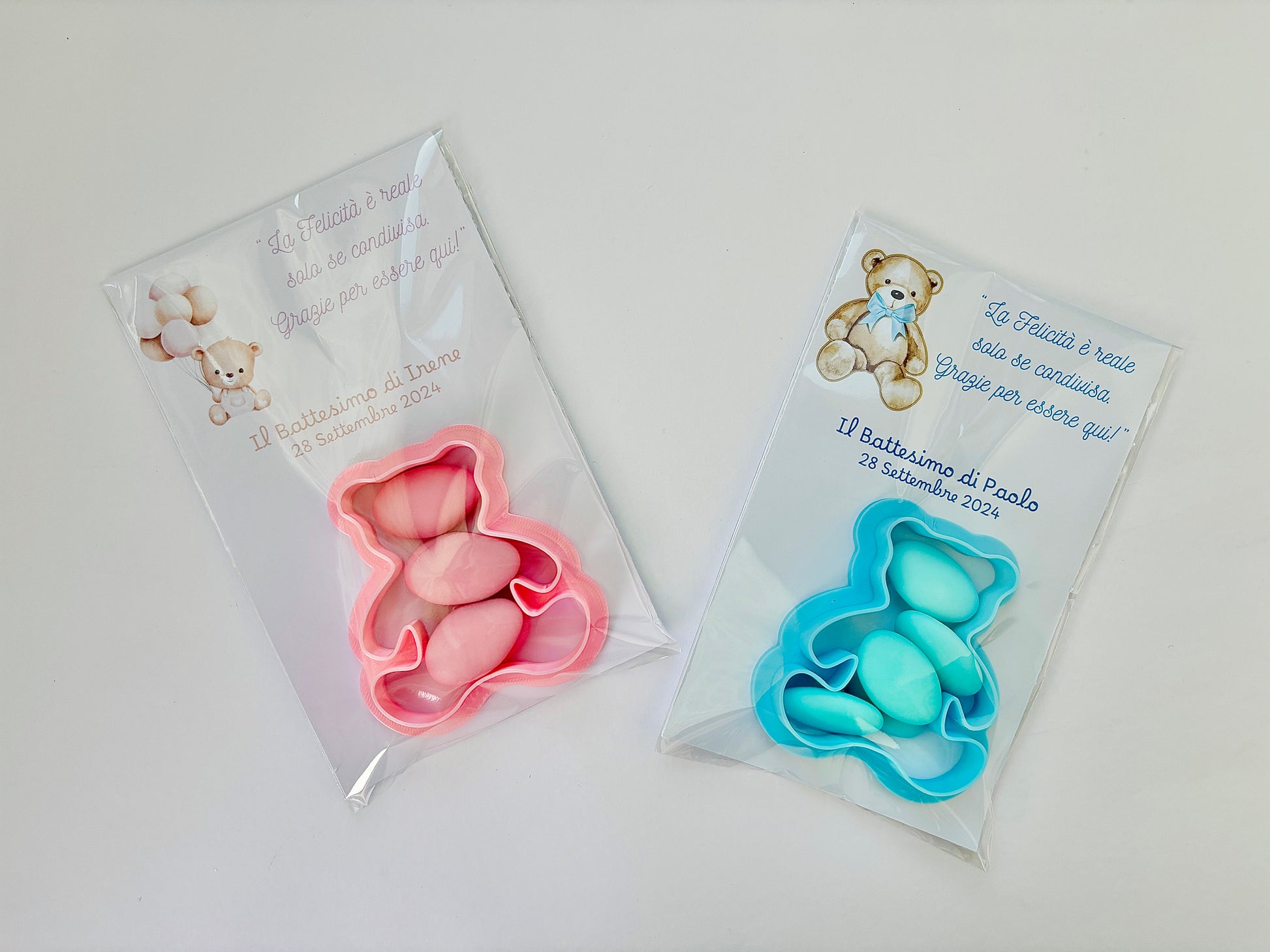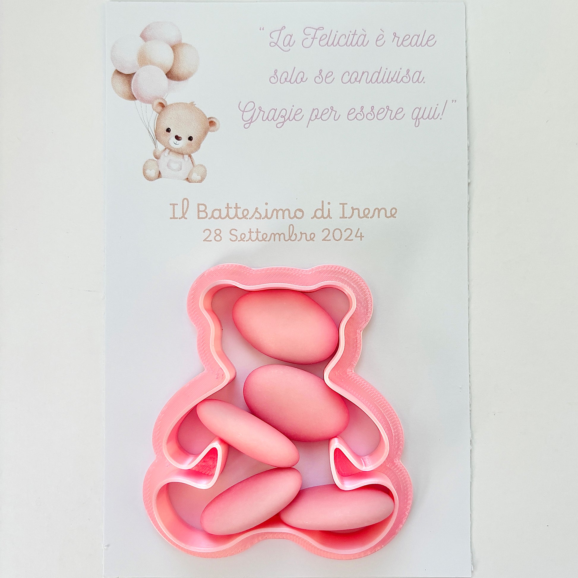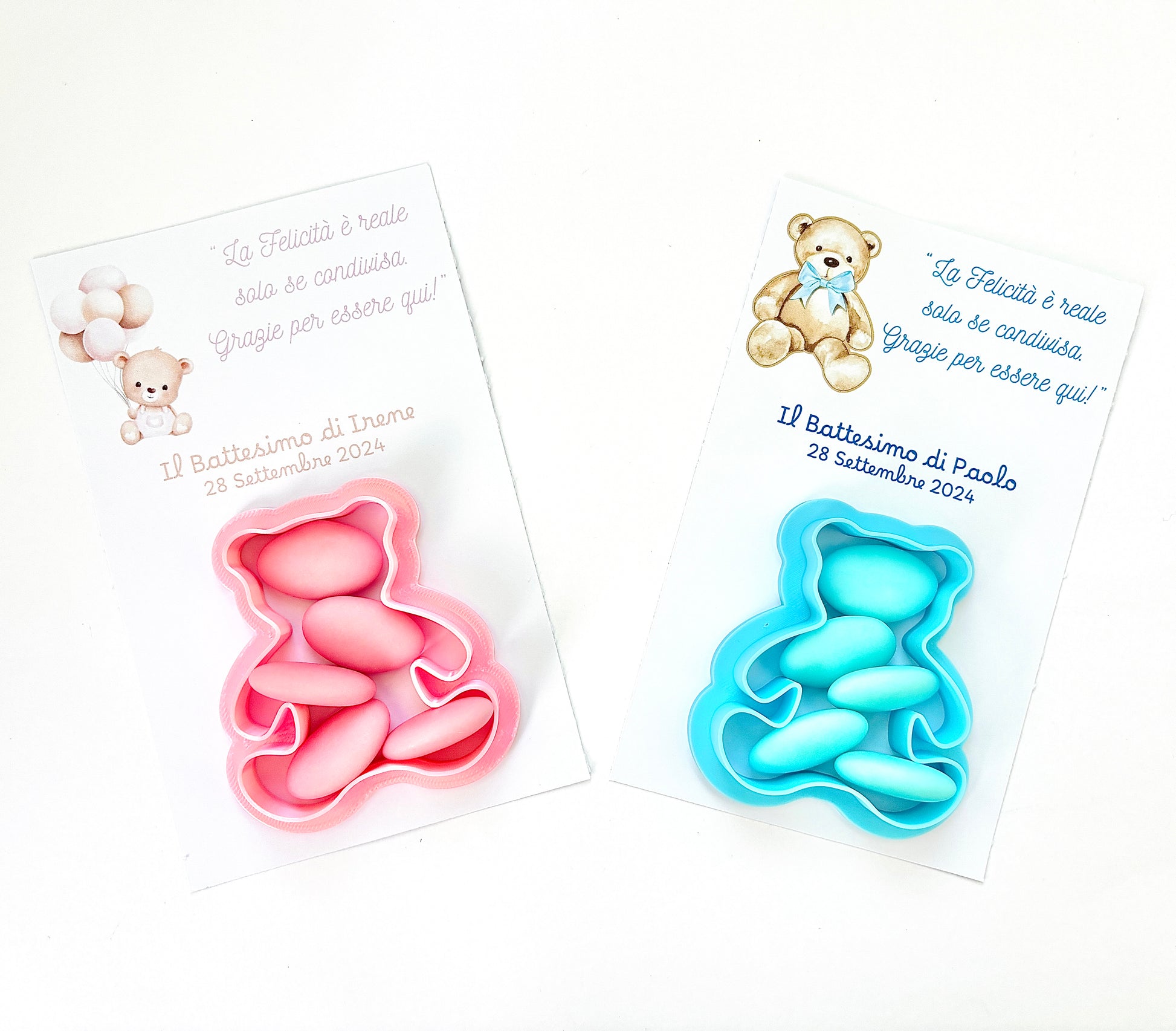 Cookie cutter in the shape of a teddy bear made using 3D printing techniques, ideal as a favor/placeholder for events such as birthdays, baptisms and small receptions, it is also possible to make it in other colors on request by also changing the cardboard label, contact us first in private.