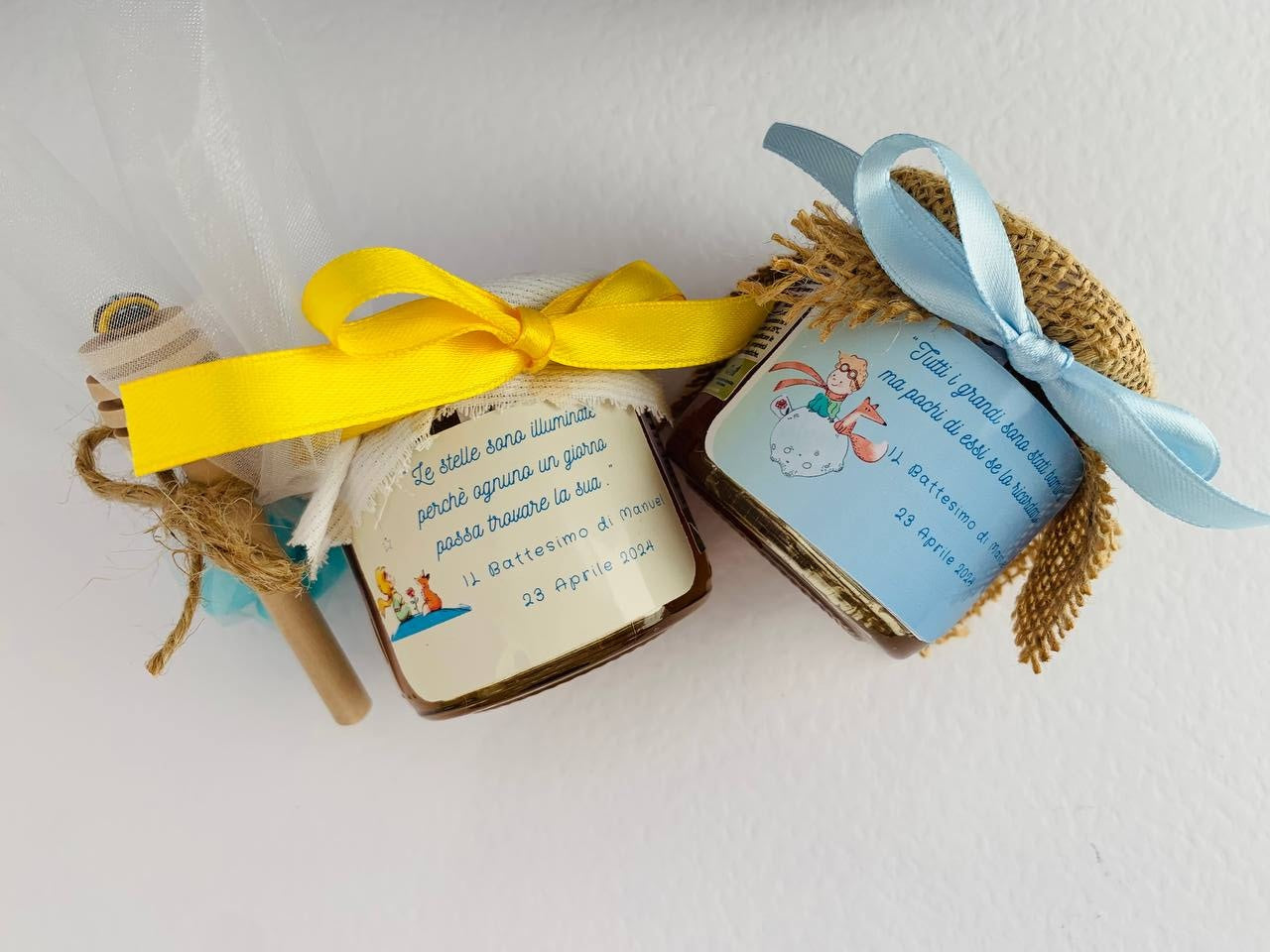 Bonbonnières Baptême Bébé PETIT PRINCE Pot de miel de fleurs sauvages artisanal 140gr - 250gr, étiquette personnalisable bleu clair