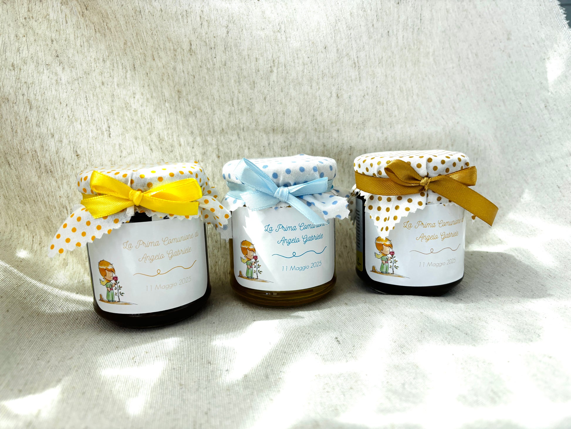 Lors de l'achat, indiquez précisément ce que vous souhaitez écrire sur l'étiquette à appliquer sur le pot et ce que vous souhaitez graver sur la boîte extérieure, la couleur du tissu choisi, la couleur du ruban et des confettis.