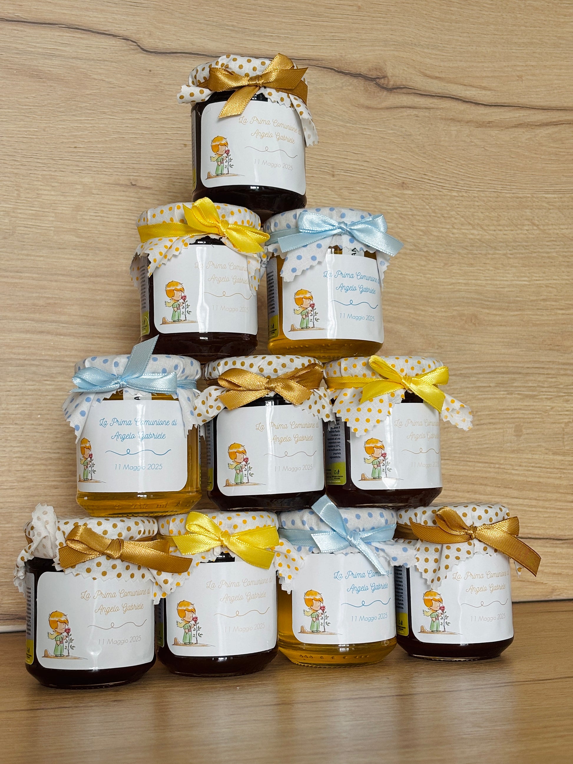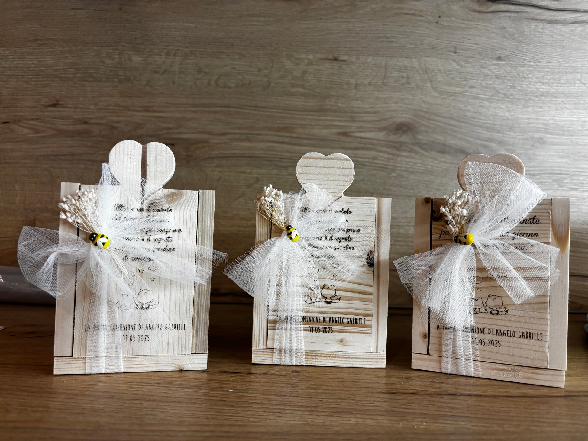Coffret en bois de sapin avec gravure personnalisée avec à l'intérieur un POT DE MIEL de 250g, choisi parmi (FLEUR DE THILLE, ACACIA ou CHÂTAIGNIER) en collaboration avec la Société Apicole Sant'Angelo, tous les pots ont une étiquette avec origine et date de péremption.