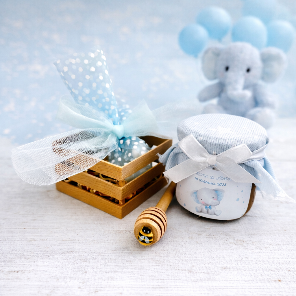 2) POT AVEC BOÎTE (le colis est complet et le pot sera à l'intérieur de la boîte, à l'extérieur il y aura les dragées et l'épandeur de miel).