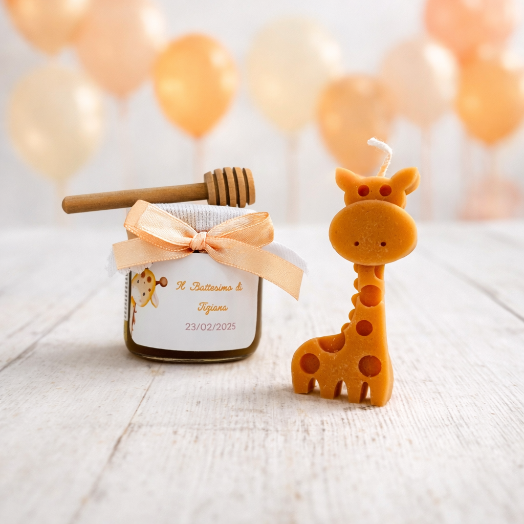 Bomboniera Battesimo cofanetto a tema Giraffa con Miele 50gr /140 gr e Candela profumata