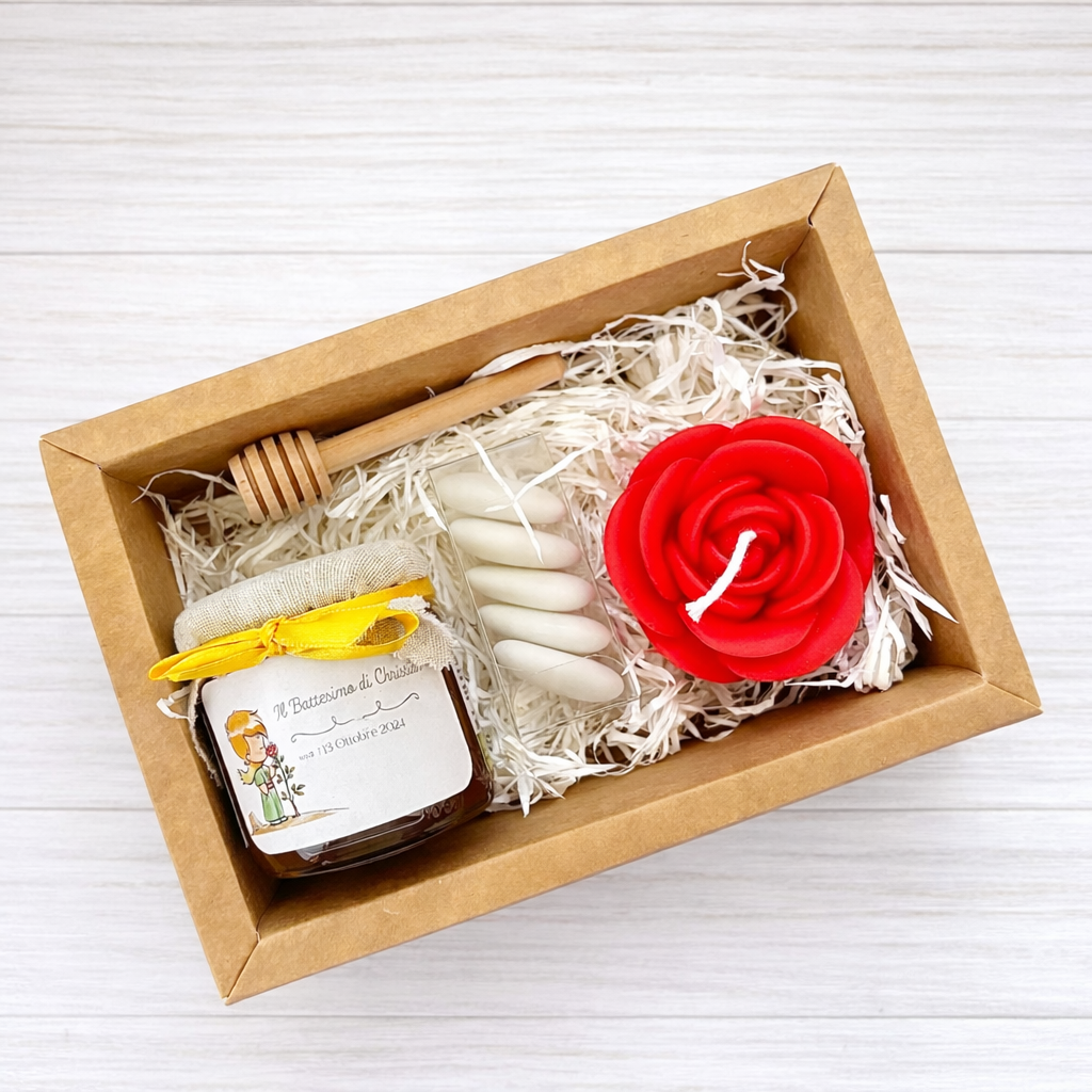 Bomboniera Battesimo cofanetto a tema Piccolo Principe con Miele 140 gr e Candela nuvola profumata o cialde brucia essenza
