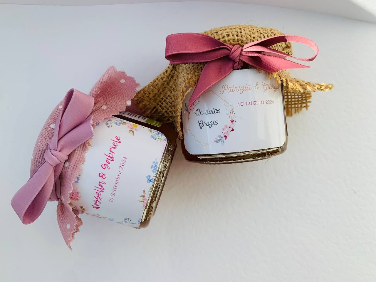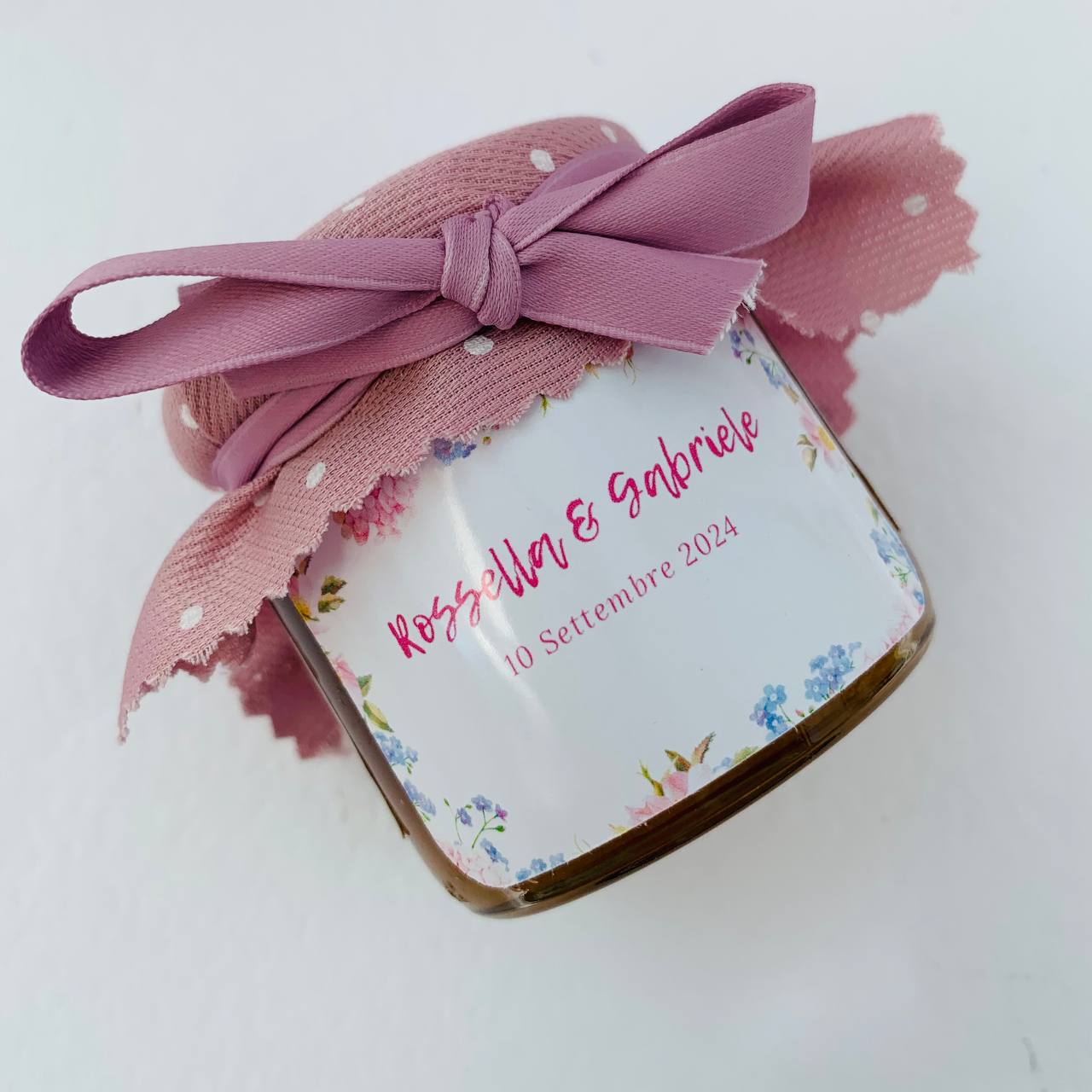 Bomboniera Matrimonio Barattolino Miele millefiori artigianale 50 gr-140gr, color rosa, fucsia, porpora, etichetta personalizzabile